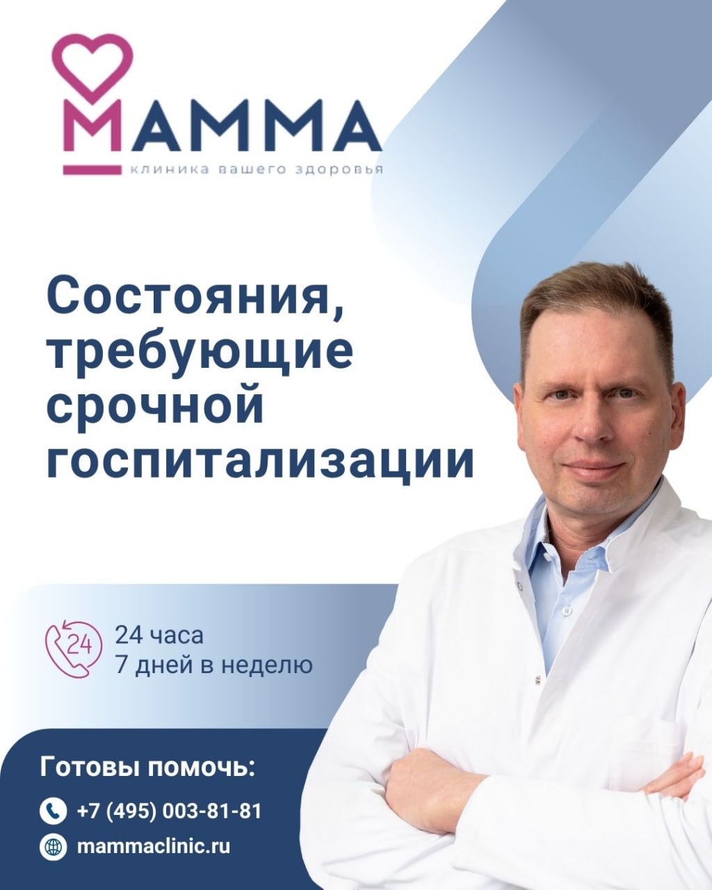Клиника МАММА оказывает круглосуточную медицинскую помощь: