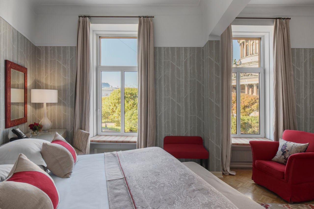 «Англетер» – один из первых отелей, построенных в Петербурге. Здание отеля расположено в самом сердце города, на Исаакиевской площади, в непосредственной близости от главных достопримечательностей Северной столицы. Классический стиль 192 номеров отеля «Англетер» был разработан директором по дизайну Rocco Forte Hotels – Ольгой Полицци.