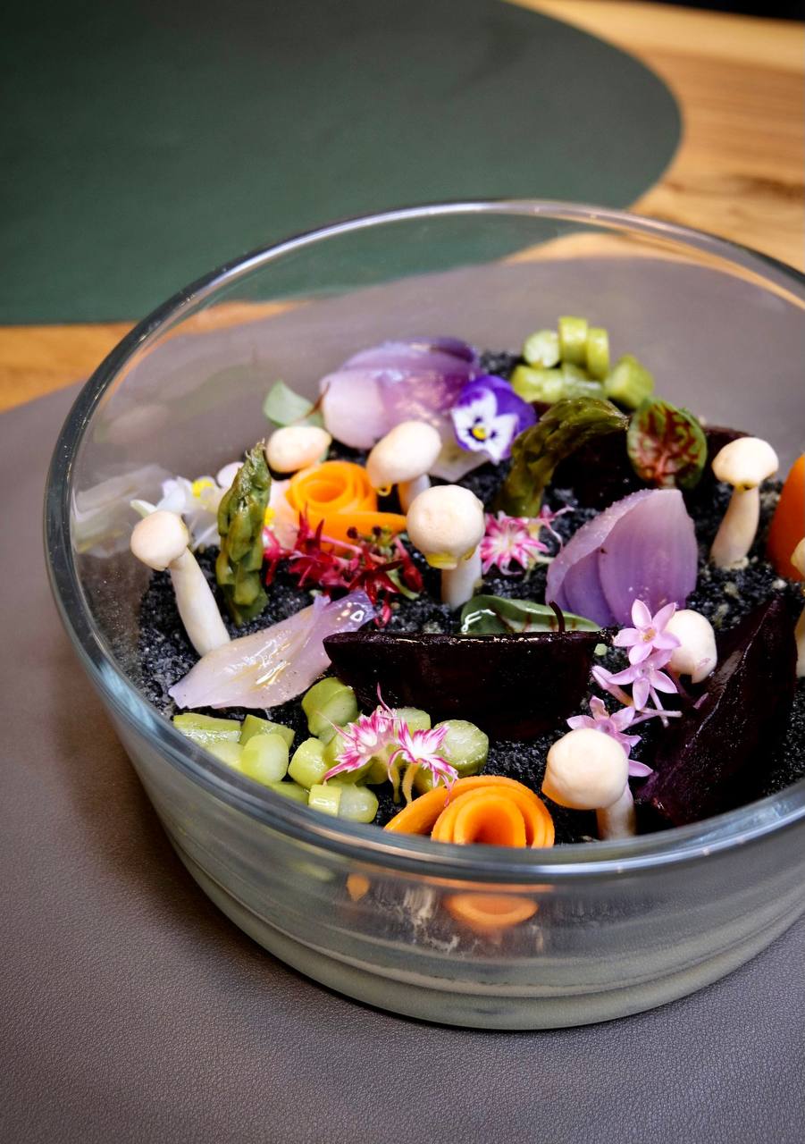 Фантазия бренд шефа ресторана Марко Якетта безгранична. «Веганский лес»- это произведение искусства в духе Арчимбольдо: хумус, угольный хлеб и весенний лес из грибов шимеджи, спаржи, моркови и свеклы.