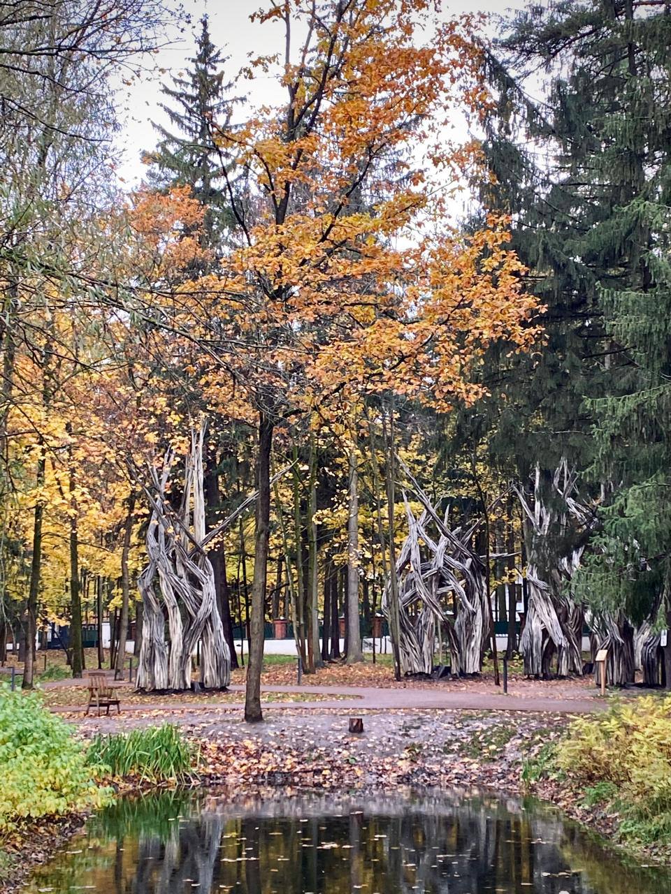 Рядом арт-обьект художника Николая Полисского, посвященный переделкинским деревьям, погибшим от жука-типографа.